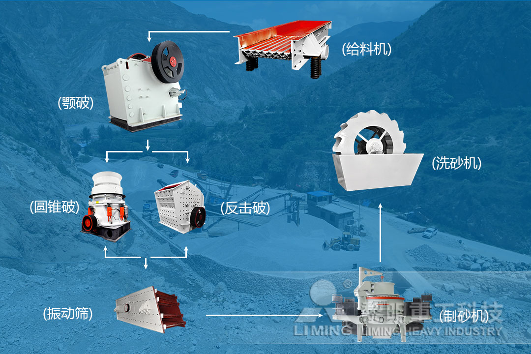 主要工艺流程为:尾矿先由颚破进行粗碎,根据生产需求,可用圆锥破或反击破进行二次破碎,破碎筛分后符合细度要求的送入制砂机进行整形和细碎,最终得到0-5mm的机制砂成品,也可搭配洗砂机进行洗选,除去杂质。