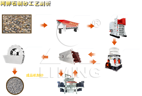 目前河卵石制砂合理的配置是粗碎用颚破,中碎用圆锥破(小产量可用细颚破),制砂用离心冲击式破碎机(5X制砂机)的三级破碎。