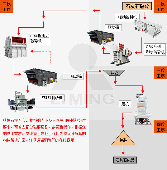石灰石或石灰岩资源丰富,原矿品位一般能满足各工业部门的要求。因此,一般只需要进行简单的洗矿,不需要采用复杂的选矿工艺进行提纯。石灰石的加工主要是粉碎、分级以及生产生石灰、熟石灰、沉淀碳酸钙、超微细(纳米)碳酸钙、二氧化碳等。石灰石一般采用干式粉碎工艺,对于冶金、道路用石灰石,将矿石破碎筛分后即可。对于细粉产品的生产,矿石经颚式破碎机、反击式破碎机或圆锥式破碎机等破碎后直接用雷蒙磨粉磨,产品细度100-325目,具体加工流程如下: