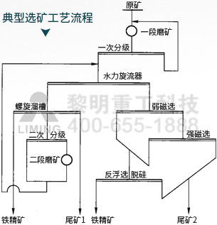 赤铁矿选矿技术 赤铁矿典型的选矿工艺流程有三种:连续磨矿―弱磁―强磁―阴离子反浮选、阶段磨矿―粗细分选―重―磁―阴离子反浮选和阶段磨矿―粗细分选―磁―重―阴离子反浮选。