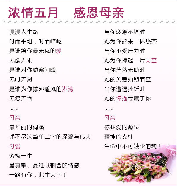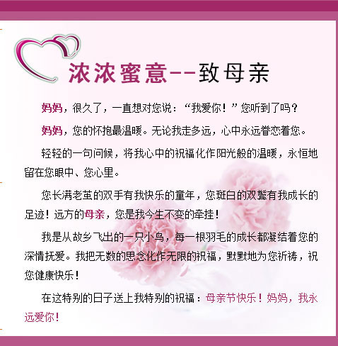 在这特别的日子送上我特别的祝福:母亲节快乐!妈妈,我永远爱你!
