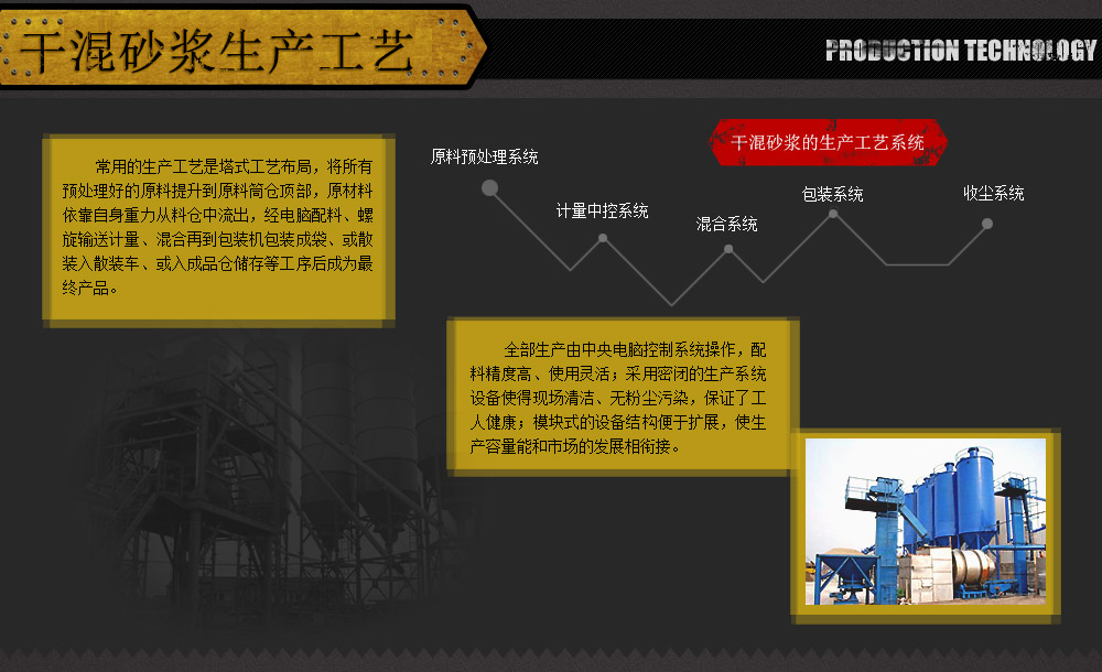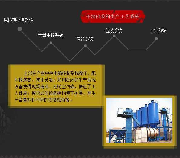 全部生产由中央电脑控制系统操作,配料精度高、使用灵活;采用密闭的生产系统设备使得现场清洁、粉尘污染小,保障了工人健康;模块式的设备结构便于扩展,使生产容量能和市场的发展相衔接。