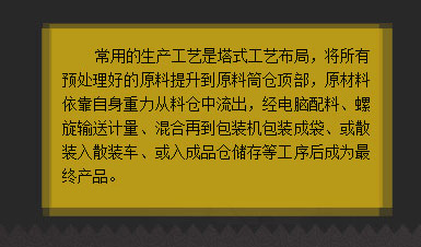 常用的生产工艺是塔式工艺布局,将所有预处理好的原料提升到原料筒仓顶部,原材料依靠自身重力从料仓中流出,经电脑配料、螺旋输送计量、混合再到包装机包装成袋、或散装入散装车、或入成品仓储存等工序后成为产品。