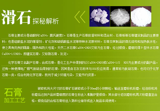 石膏主要成分是硫酸钙CaSO4,莫氏硬度2。石膏是生产石膏胶凝材料和混合材、石膏板等石膏建筑制品的主要原料,也是硅酸盐水泥的缓凝剂、矿化剂和硫铝酸盐水泥等特种水泥原材料。石膏及其制品的微孔结构和加热脱水性,使之具有优良的隔音、隔热和防火性能。天然二水石膏CaSO4.2H2O又称为生石膏,经过煅烧、磨细可得β型半水石膏CaSO4.1/2H2O,即建筑石膏,又称熟石膏、灰泥。