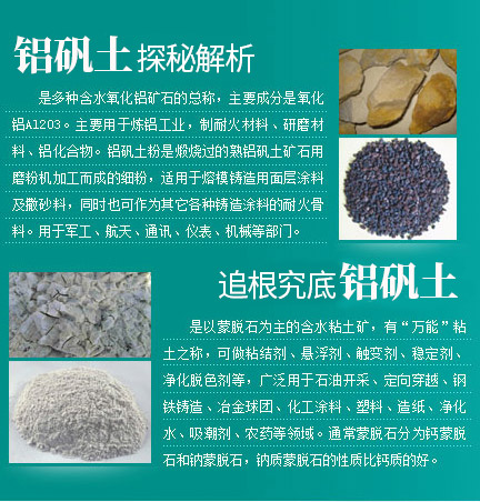 是多种含水氧化铝矿石的总称,主要成分是氧化铝Al2O3。主要用于炼铝工业,制耐火材料、研磨材料、铝化合物。铝矾土粉是煅烧过的熟铝矾土矿石用磨粉机加工而成的细粉,适用于熔模铸造用面层涂料及撒砂料,同时也可作为其它各种铸造涂料的耐火骨料。用于军工、航天、通讯、仪表、机械等部门。