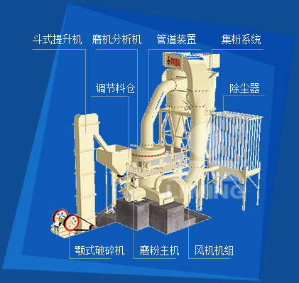 大块非金属矿经颚式破碎机破碎后,由斗式提升机送至储料仓,通过电磁振动给料机均匀连续地送入磨粉机主机内研磨,研磨后的粉末在鼓风机的作用下吹向选粉机进行分选。符合细度的非金属矿粉由管道输送到储料仓;不合格的粒子重回磨粉机内研磨。整个系统在负压状态下运行,粉尘不外溢,从而保护了周边环境。若经脉冲除尘器过滤,环保效果更佳。