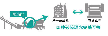 三组合移动站一种车身为8种机型通用,喂料单元互换系统、破碎单元互换系统和筛分单元互换系统,只需再投资单机设备成本,短时间内,即可在同一车身上实现不同型号喂料单元、破碎单元和筛分单元互换系统,整机各系统之间的准确匹配,适应场合更广泛,破碎功能更优良,客户的消费品得到增值。