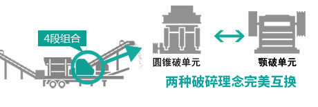 给料单元互换系统和破碎单元互换系统,只需再投资单机设备成本,短时间内,矿区现场即可在同一车身上实现不同型号给料单元互换系统,反击破与颚破的互换系统,整机各系统之间的准确匹配,适应场合更广泛,破碎功能更优良,客户的消费品得到增值。