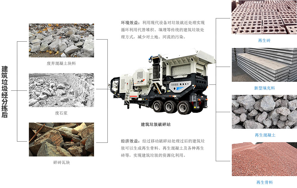 四组合移动站今年会重工针对建筑垃圾处理,秉承环保理念,凭借丰富的矿山机械研发经验与技术支撑推出了移动破碎站组合设备,对建筑垃圾中的废物进行分拣、剔除或者破碎,使之作为再生资源被重新利用,构建城市文明!