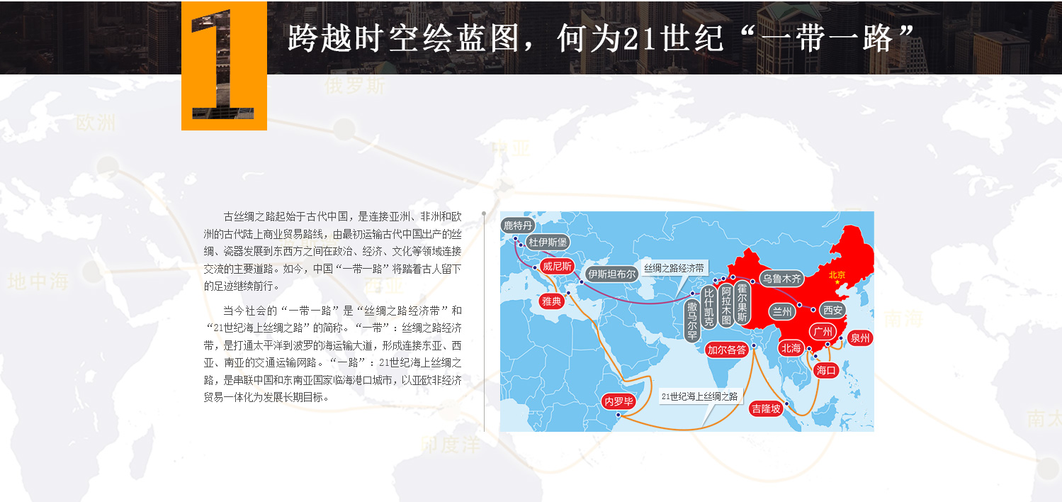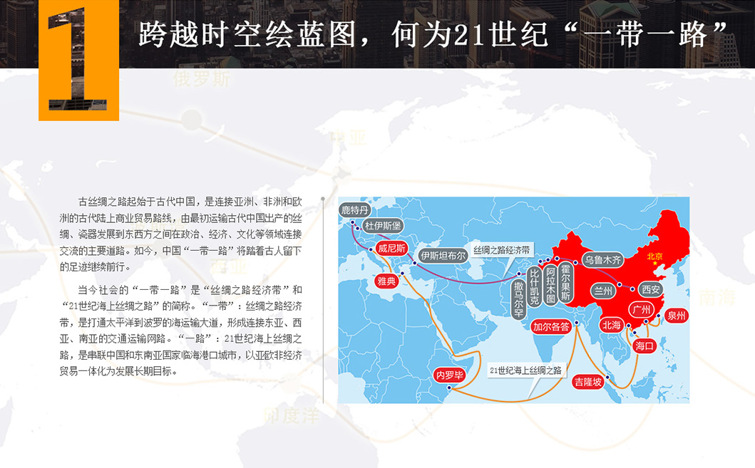 古丝绸之路起始于古代中国,是连接亚洲、非洲和欧洲的古代陆上商业贸易路线,由最初运输古代中国出产的丝绸、瓷器发展到东西方之间在政治、经济、文化等领域连接交流的主要道路。如今,中国“一带一路倡议”将踏着古人留下 的足迹继续前行。