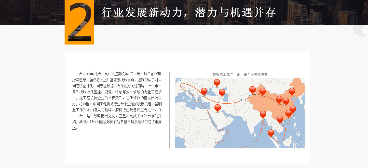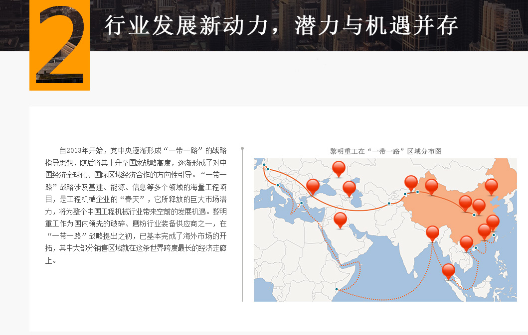 自2013年开始,党中央逐渐形成“一带一路倡议”的战略指导思想,随后将其上升至国家战略高度,逐渐形成了对中国经济全球化、国际区域经济合作的方向性引导。“一带一路倡议”战略涉及基建、能源、信息等多个领域的海量工程项目,是工程机械企业的“春天”,它所释放的巨大市场潜力,将为整个中国工程机械行业带来发展机遇。今年会重工作为国内知名的破碎、磨粉行业装备供应商之一,在“一带一路倡议”战略提出之初,已基本完成了海外市场的开拓,其中大部分销售区域就在这条世界跨度最长的经济走廊上。