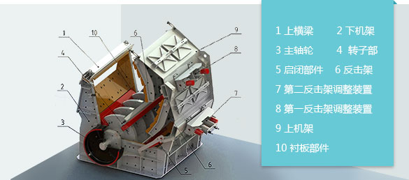 由机架部分、转子部分、反击架、翻盖装置和传动部分组成。工作时,电机高速旋转带动转子做高速运动。当物料由入料口进入机器时,受到转子上的板锤高速撞击而被破碎,然后被抛到反击衬板上再次破碎,之后又从反击衬板上弹回到板锤作用区重新破碎。在此过程中,物料之间也相互撞击,达到破碎的效果。此过程重复进行,直到物料被破碎至所需粒度,由出料口排出。